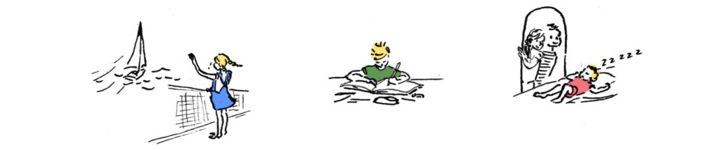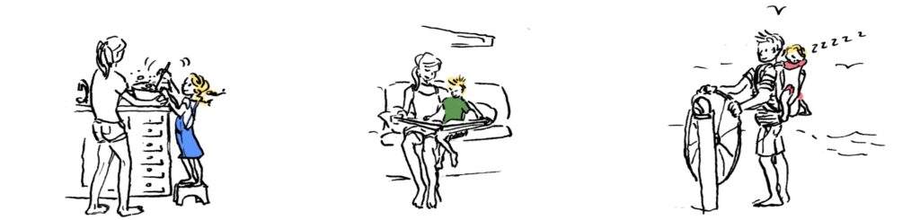 Les enfants ont cette grande capacité d’adaptation. Lors de longues traversées en mer (notre plus longue a duré 26 jours), cette capacité s’est révélée précieuse. Avec eux, on prend plaisir à répéter des actions à heures fixes : « C’est l’heure des cookies ! », « C’est l’heure de la patouille ! »… Nous nous repérons en cochant des cases sur un calendrier, et pratiquons avec soin de petits rituels qui rendent heureux car on les attend, on les prépare, et surtout, on les vit tous ensemble. Par exemple, l’un de nos rituels favoris était celui des crêpes du dimanche soir.