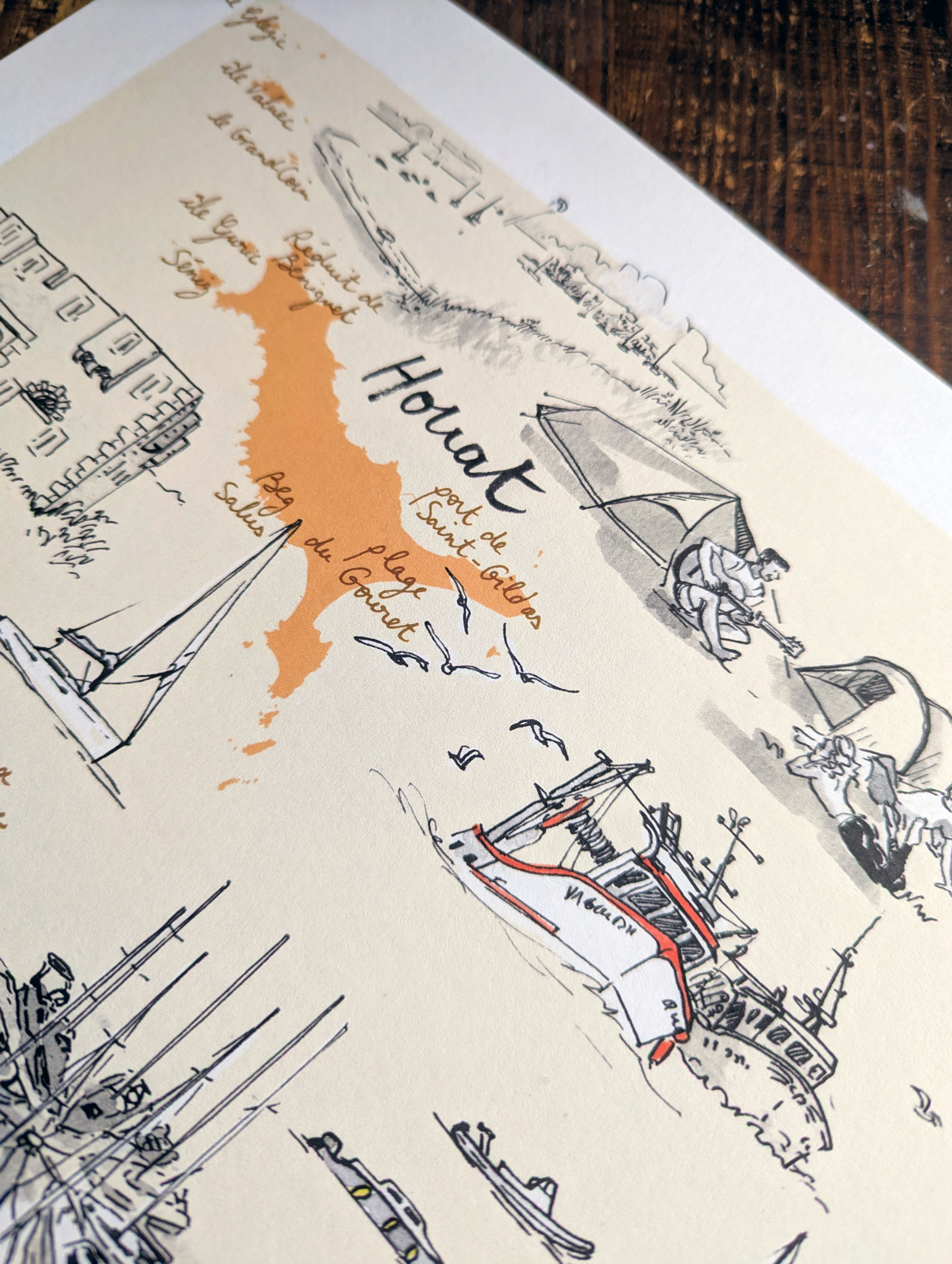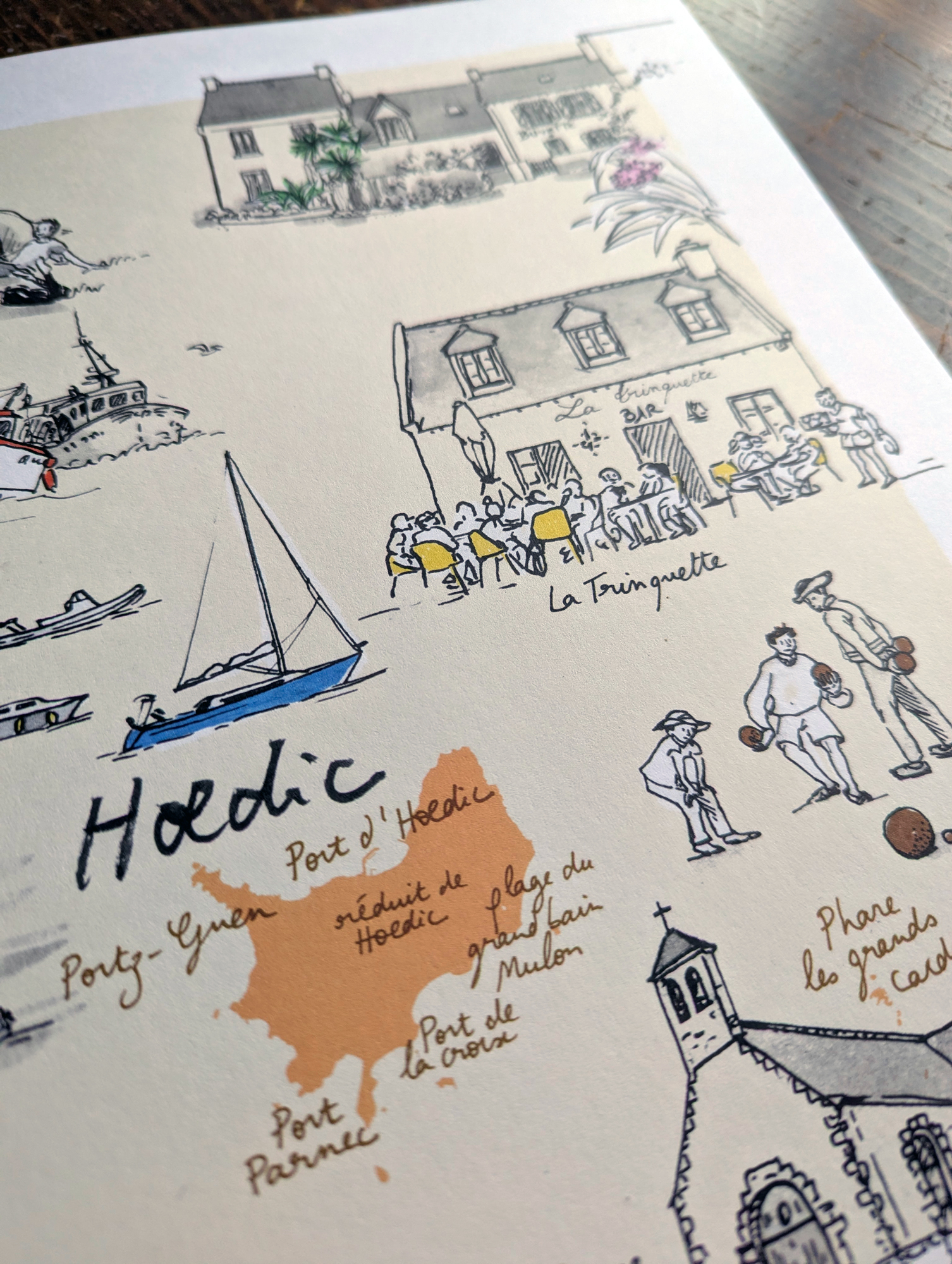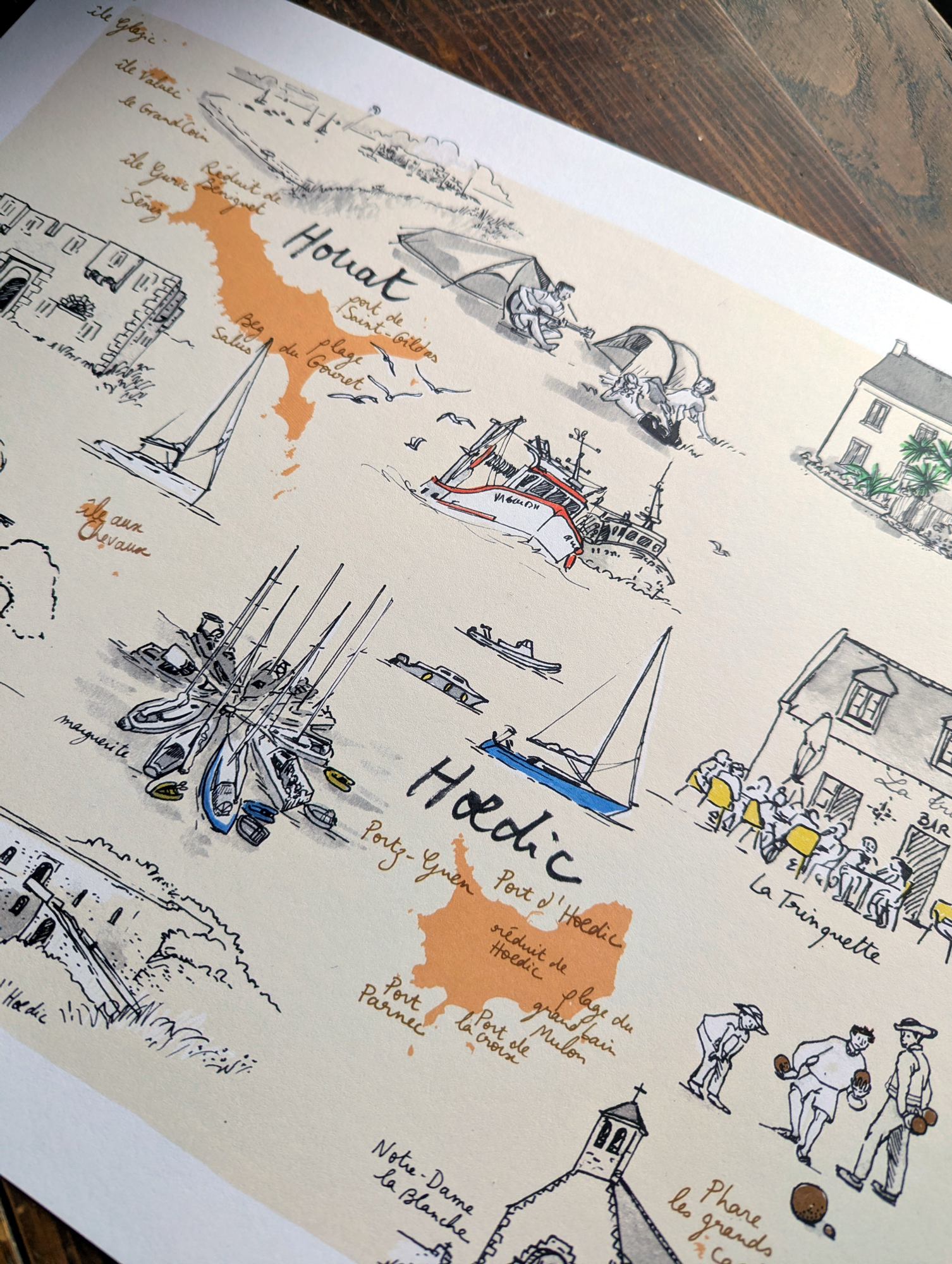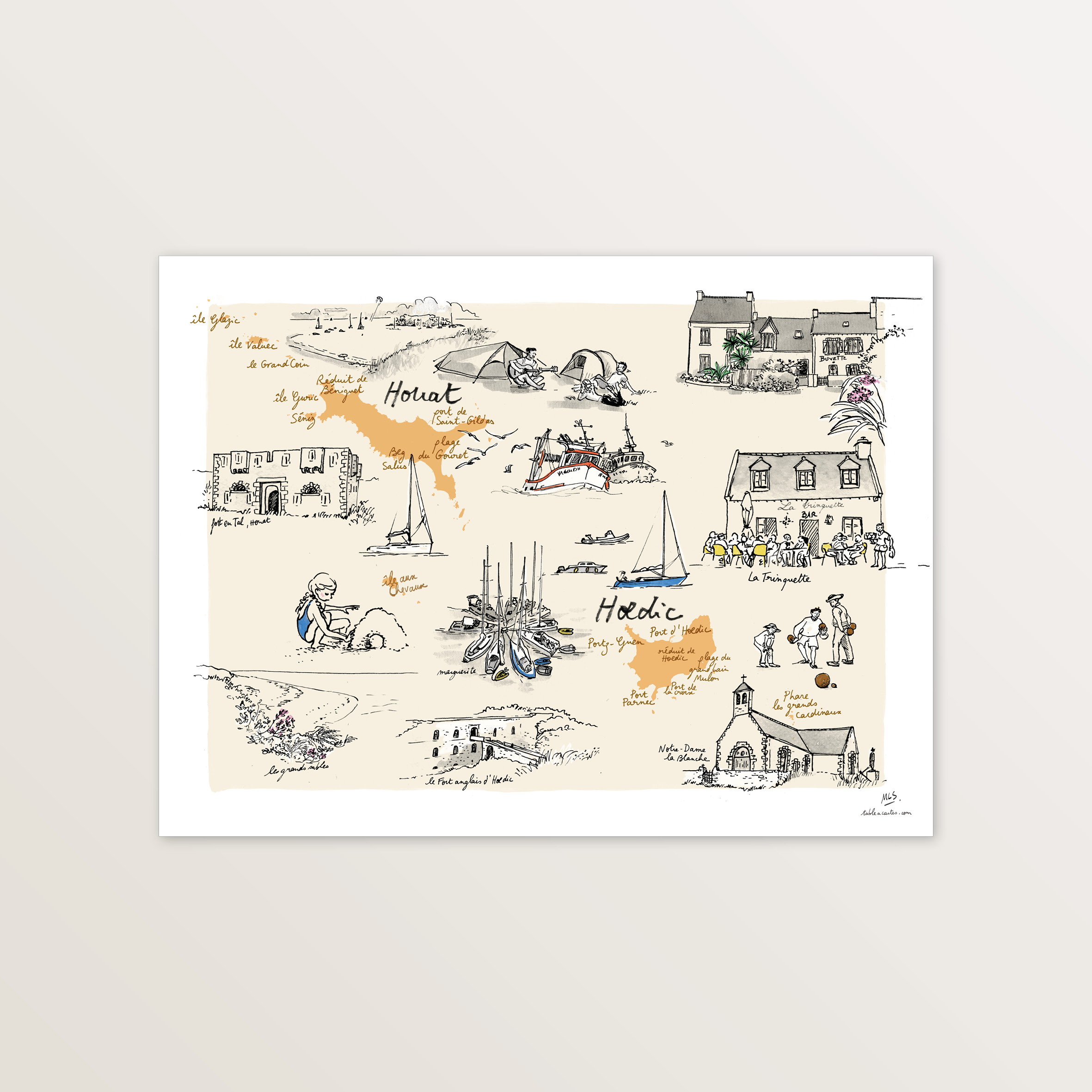 Uniques et minimalistes, les îles de Houat et Hœdic sont à nul autre pareil. Sur cette carte illustrée, retrouvez l’âme de ces petits morceaux de paradis sauvage, où la vie marque une pause pour nous laisser le temps de souffler :