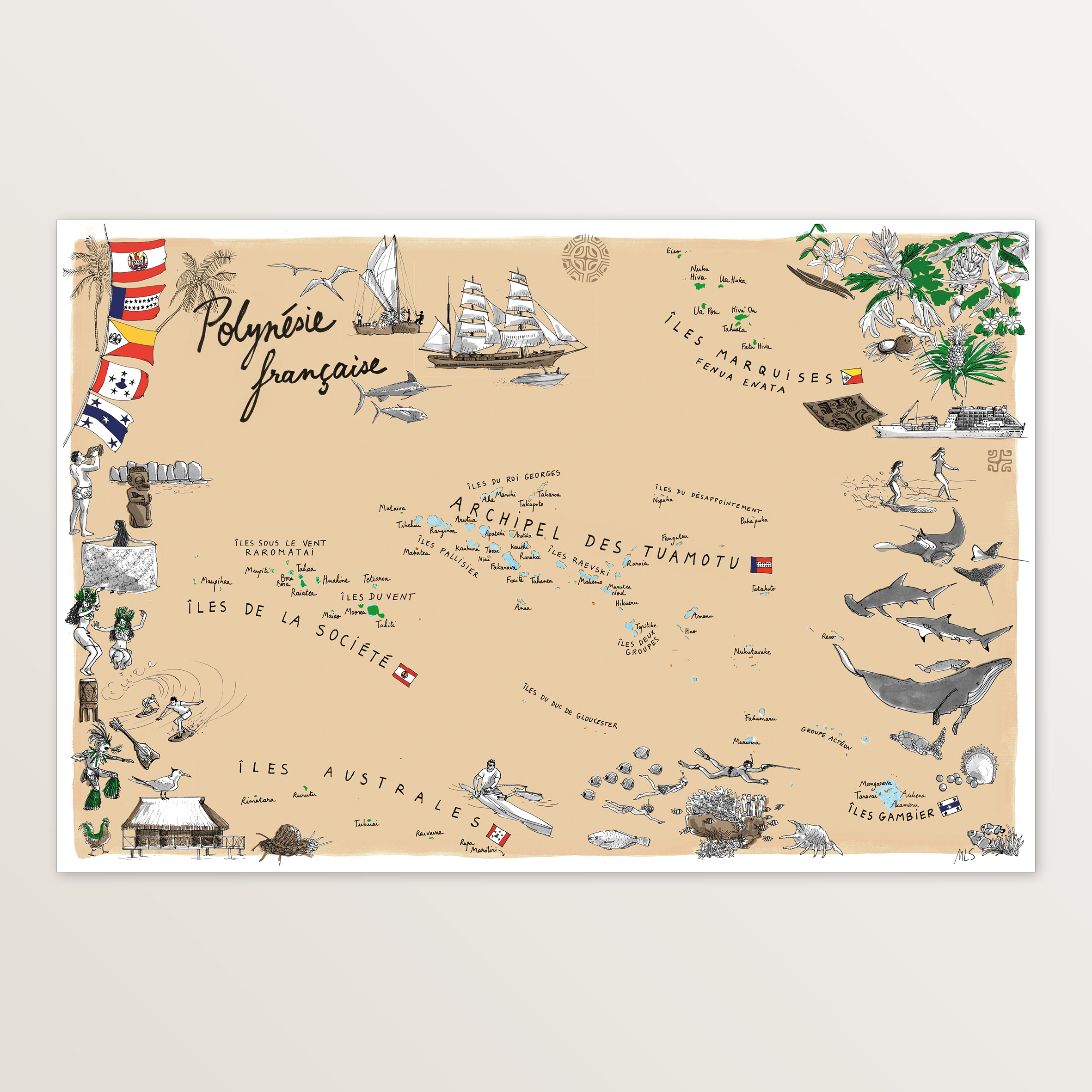 Cette carte est une invitation au voyage et à la découverte de la culture polynésienne, et une manière de mieux percevoir sa géographie. Une foule d’éléments dessinés enrichit l’illustration, donnant vie aux Vahinés, aux Tanés, aux traditions, à la faune et à la flore locales.