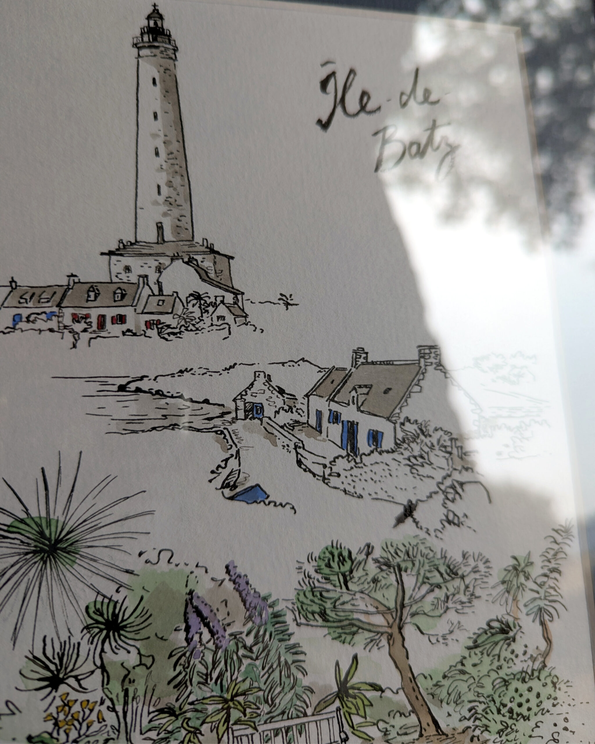Dessin original du phare de l’île de Batz et du jardin Georges Delaselle, réalisé à l’encre de Chine et aquarelle.