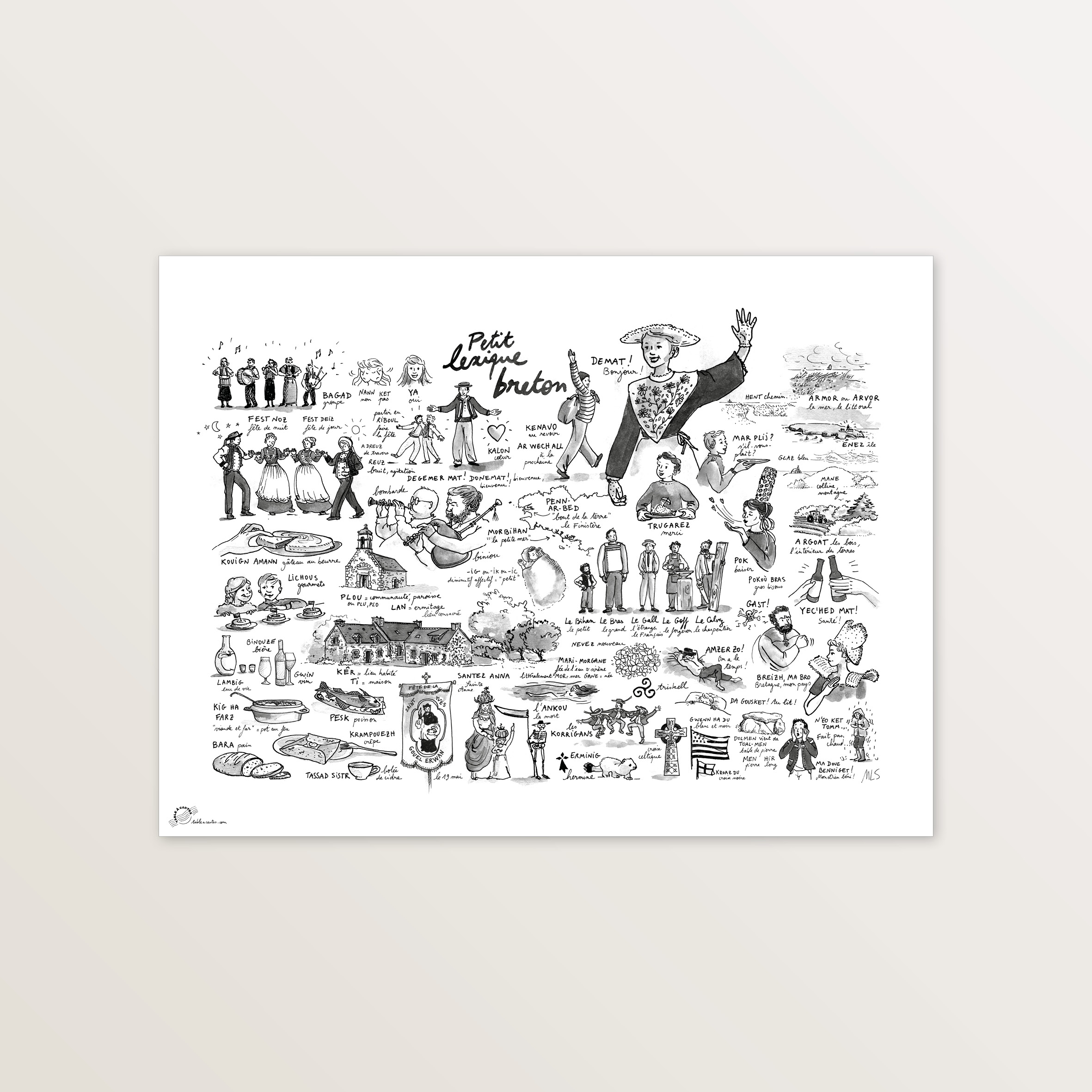 Je vous invite à célébrer l’âme de cette belle région à travers sa langue, et en particulier, les expressions bretonnes. Ambiance chaleureuse et rugueuse, typique de la culture celte, cette illustration évoque le cœur festif et fervent de notre chère Breizh, son patrimoine d’hier et d’aujourd’hui.